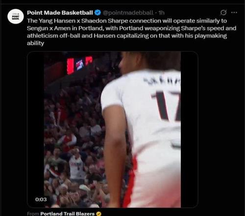 雷速体育10月11日宣 NBA季前赛,开拓者124-123战胜国王。赛后美媒Point Made Basketball连续发文赞扬杨瀚森,并表示杨瀚森与谢顿·夏普的组合类似于开拓者自己的申京与阿门。以下为原文: